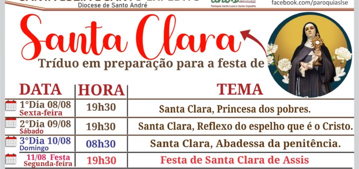 Com alegria e fé, convidamos você e sua família! Em agosto, daremos início ao Tríduo em honra a Santa Clara, modelo de humildade, oração e entrega a Deus. Vamos juntos celebrar essa grande santa...