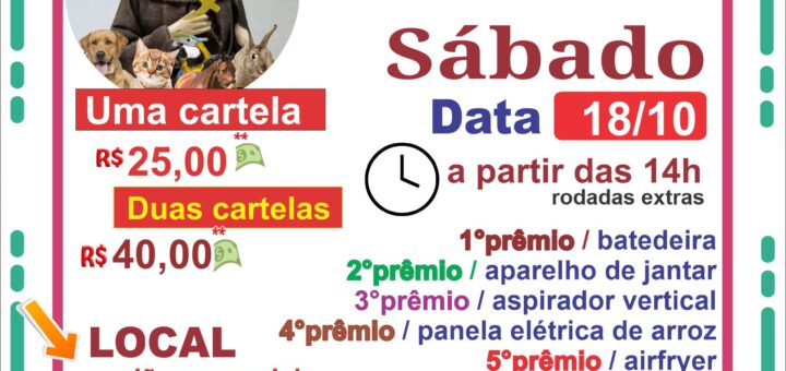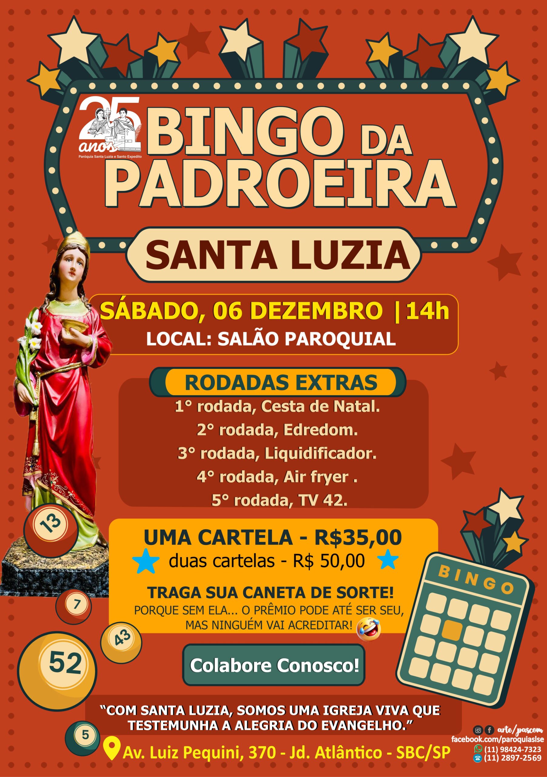 SÁBADO ESPECIAL DE BINGO! Dia: 18/10 (sábado). Horário: 14h. Local: Salão Paroquial. Paróquia Santa Luzia e Santo Expedito Av. Luiz Pequini, 370 – Jardim Atlântico, São Bernardo do Campo. Venha participar, traga a família...