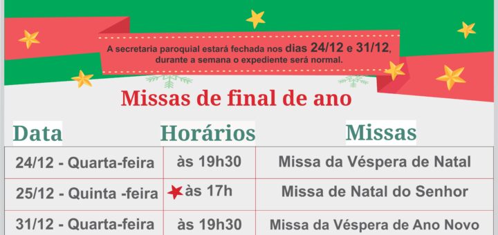 Convite para as Missas de Natal A Paróquia Santa Luzia e Santo Expedito convida toda a comunidade para participar conosco das celebrações especiais de fim de ano. 24/12 – quarta-feira 19h30 Missa da Véspera...